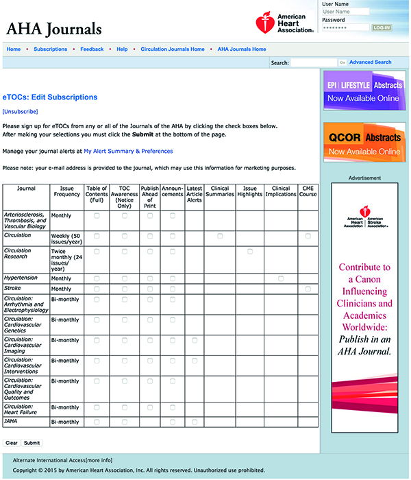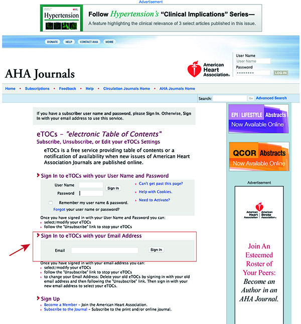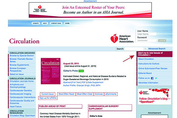 注意右边有一个“Alert me to new issues of Circulation”,这就是邮件通知的地方。不同的杂志在表述上略有不同,包括“E-alert”、“Email-Alert”或者“Alert”等。