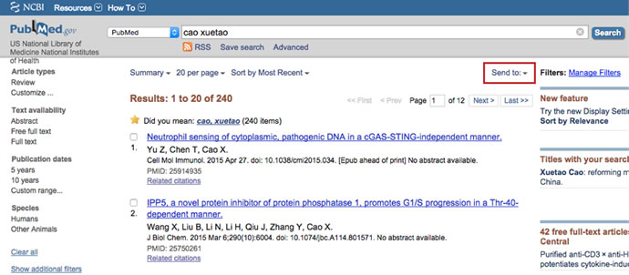 在此,笔者拟图解如何将PubMed中的文献批量导入EndNote。比如某研究者欲检索曹雪涛教授发表的论文,在PubMed中输入“cao xuetao”,得到如下结果,如图所示: