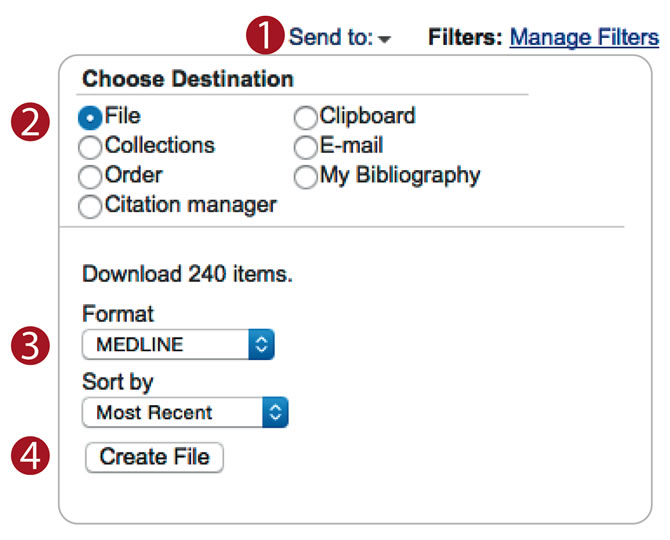 点击界面中的Sendto,在弹出的菜单中点击File,之后在Format菜单中点击MEDLINE,再点击Create File。这样PubMed就会自动下载一个文本文件到本地电脑,文件默认名字是pubmed_results.txt。这里需要注意的是,在Format中一定要选择Medline,千万不要选其它格式,如下图所示。