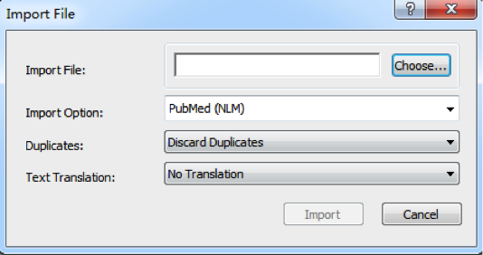 此时会弹出一个菜单:这里就十分关键了,先点击File对话框后面那个Choose,选中刚才从PubMed中下载下来的txt文件。记住在Import Option中一定要选择PubMed (NLM),有时这个地方默认的不是PubMed (NLM),则需要在下拉菜单中找到Other Filters,之后再在众多的选项中找到PubMed (NLM),根据笔者的经验,只要用过一次PubMed (NLM),这个选项就会自动保留在下拉菜单中。