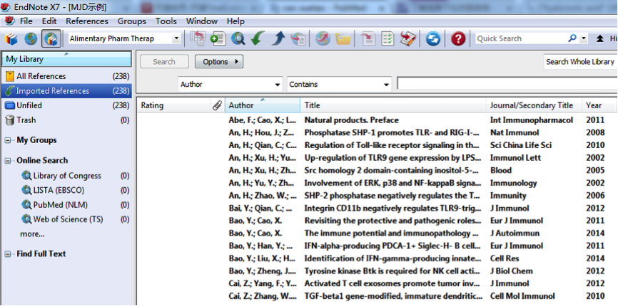 这样所有您需要的文献,已经全部被导入EndNote。接下来您就可以对文献进行分组管理和查找全文了。